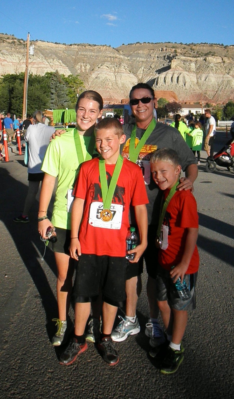 This is us AFTER the race. Again I had to ask another stranger to take our picture. I really don't like that. Also, since we had to run back to the cottage to hurry and shower for the wedding we only got a picture of John headed to the finish line instead of a bunch of fun pictures of everyone running as we drive past them down the course from the top of Bryce Canyon. Oh Well. By the time Sophie and I showered and got down to the fish line we had missed seeing Brian and Joel finishing. We decided to check to see what place the boys came in to see if they by any chance placed and sure enough, just because we were in a hurry, they did. They crossed the finish line at the same exact time which timed them for 3rd! So we had to sit around for an extra half an hour to pick up their Bronze medals. It was really cool. John took 2nd in his age group and took a Silver. 1st place in his age group was the guy in the wheelchair!