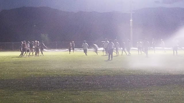 Monday 5-14-18 Every year we have an end of Rugby Party at the Snow Canyon High School Pitch. The Alumni come and play barefoot and all the kids sit around and watch. It's kind of weird. Then we eat and then the coaches give awards to the Varsity boys. Which doesn't ever pertain to us, yet. And we don't really know anyone, so we just entertain ourselves. This year we knew a couple people but it was still about the same. It wasn't until it was over, the sprinklers came on, and every went home that the fun began. All the 7/8th graders played a barefoot game against the JV/whatever Varsity kids didn't have girlfriends to go to or their own cars. It was awesome. As I was taking the chairs to the car I stopped to take these amazing pictures through the mist of sprinklers. I thought they were great! They sure were having a great time! Ben said that he forgot that rugby could be that fun.